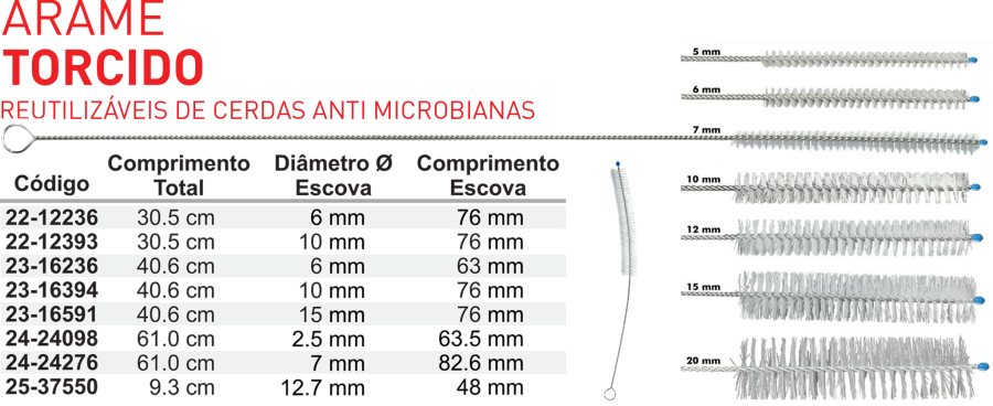 Escovas reutilizáveis para limpeza de canulados com tratamento nas cerdas anti microbianas, escova medindo de 9,3 cm a 61 cm de comprimento com diâmetro a partir de 6 mm. Com ponta azul para segurança do usuário e canulado