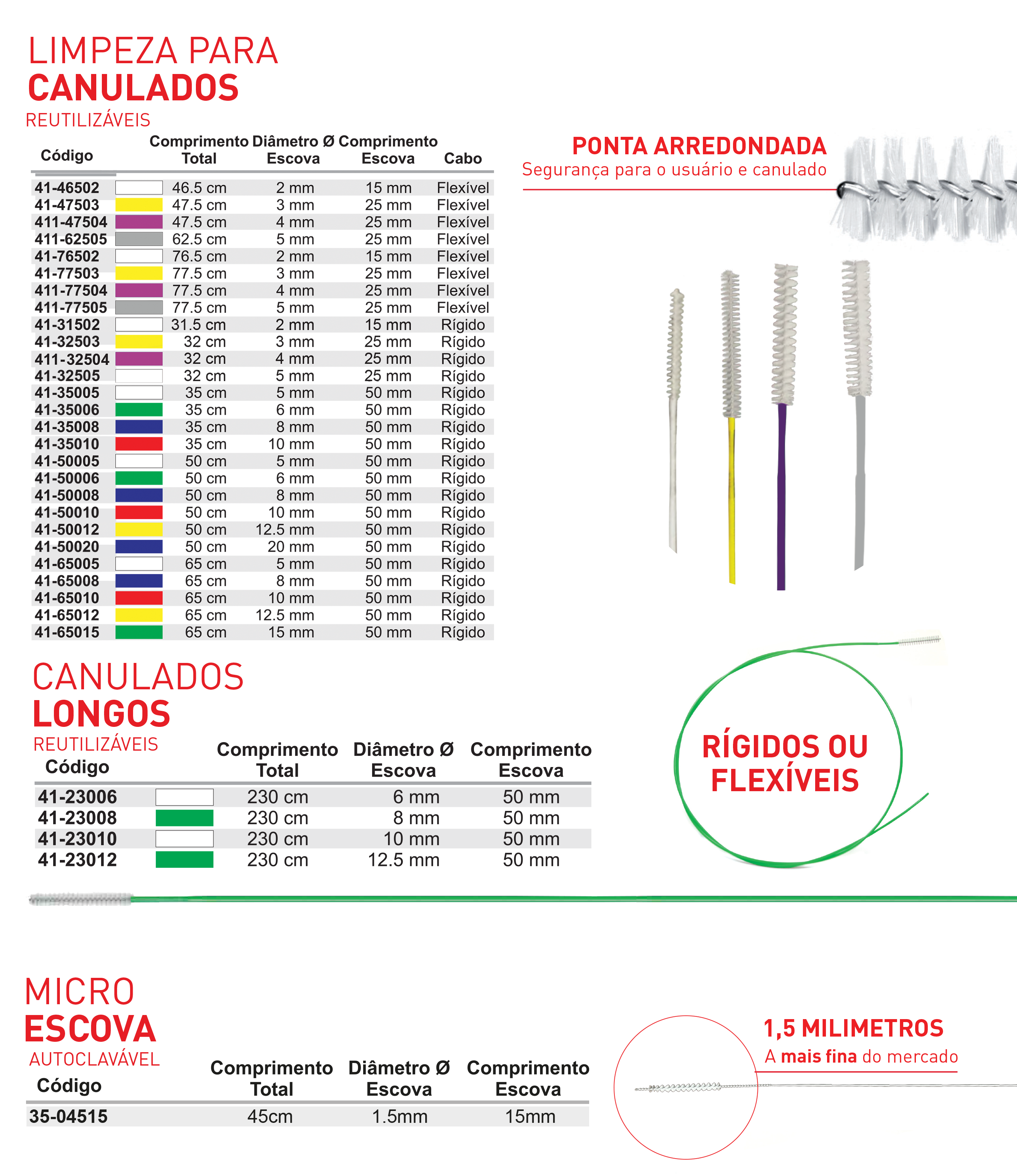 Escovas reutilizáveis para limpeza de canulados, escova medindo de 35 cm a 230 cm de comprimento com diâmetro a partir de 1,5mm.